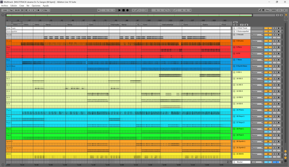 ✅ 22 pistas de audio (Piano, keys, synths, pads, electric guitars, percusión, drums [bateria] y Voces)