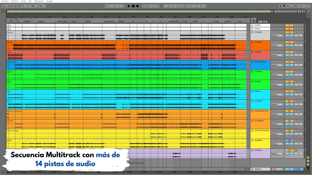 ✅ 15 pistas de audio (Piano, keys, synths, pads, percusión, drums [bateria] y Voces)