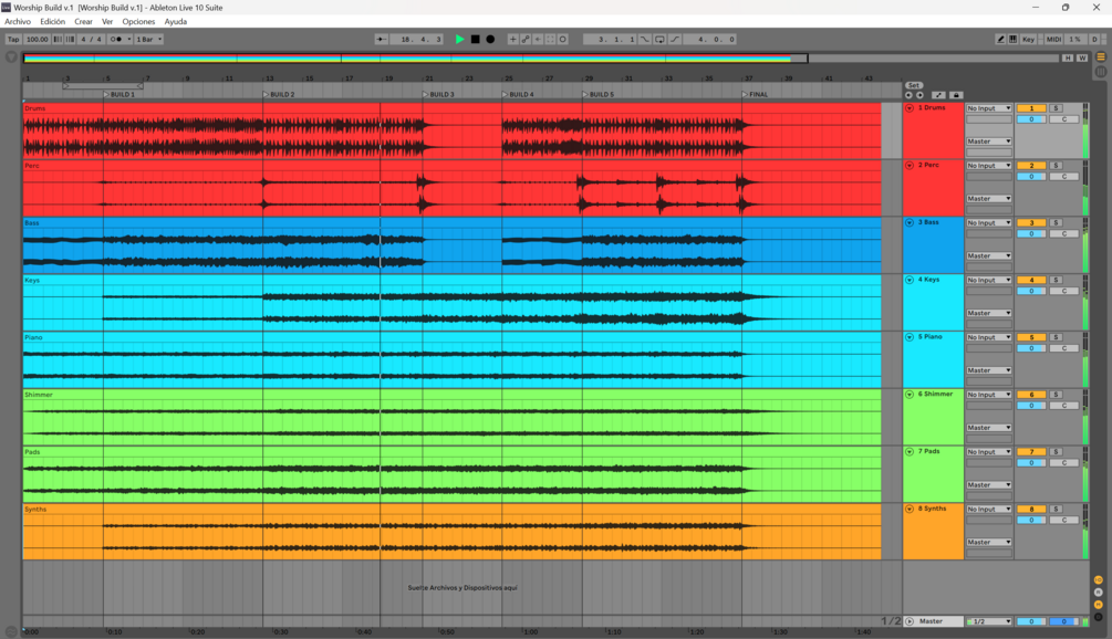 ✅8 pistas de audio (Piano, keys, synths, pads, percusión, drums [bateria] y Voces)